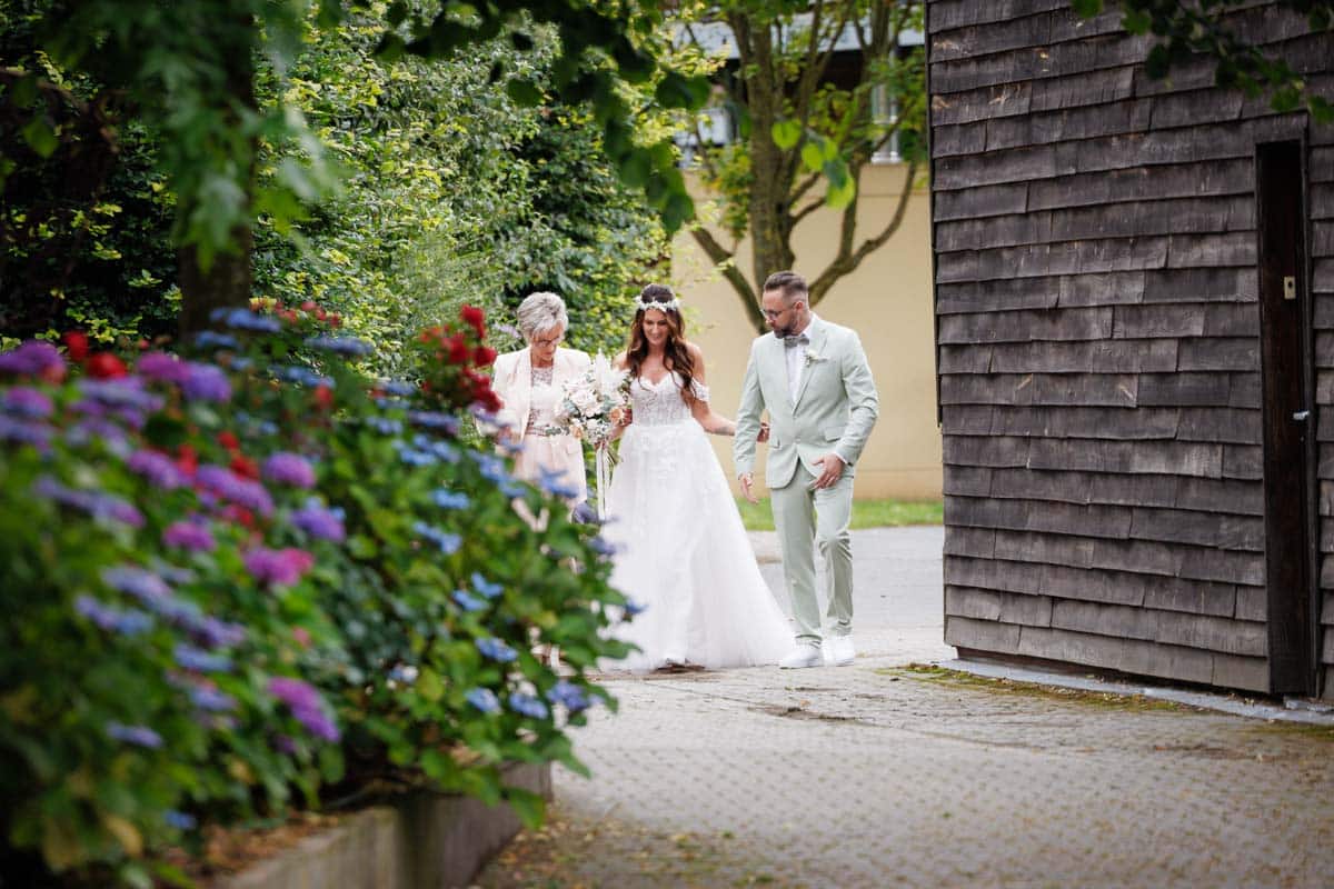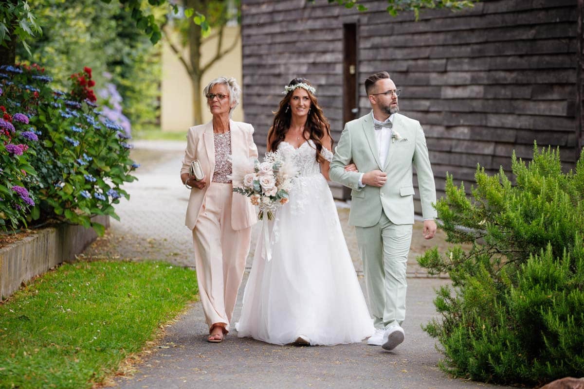 Gestartet sind wir mit dem Getting Ready der Braut. Für mich immer ein Highlight, weil hier so viel Vorfreude, Aufregung und Emotion in der Luft liegt. Sabrina hatte ihre liebsten Mädels um sich, die ihr halfen, ins Kleid zu schlüpfen – und natürlich durfte dabei viel gelacht werden.