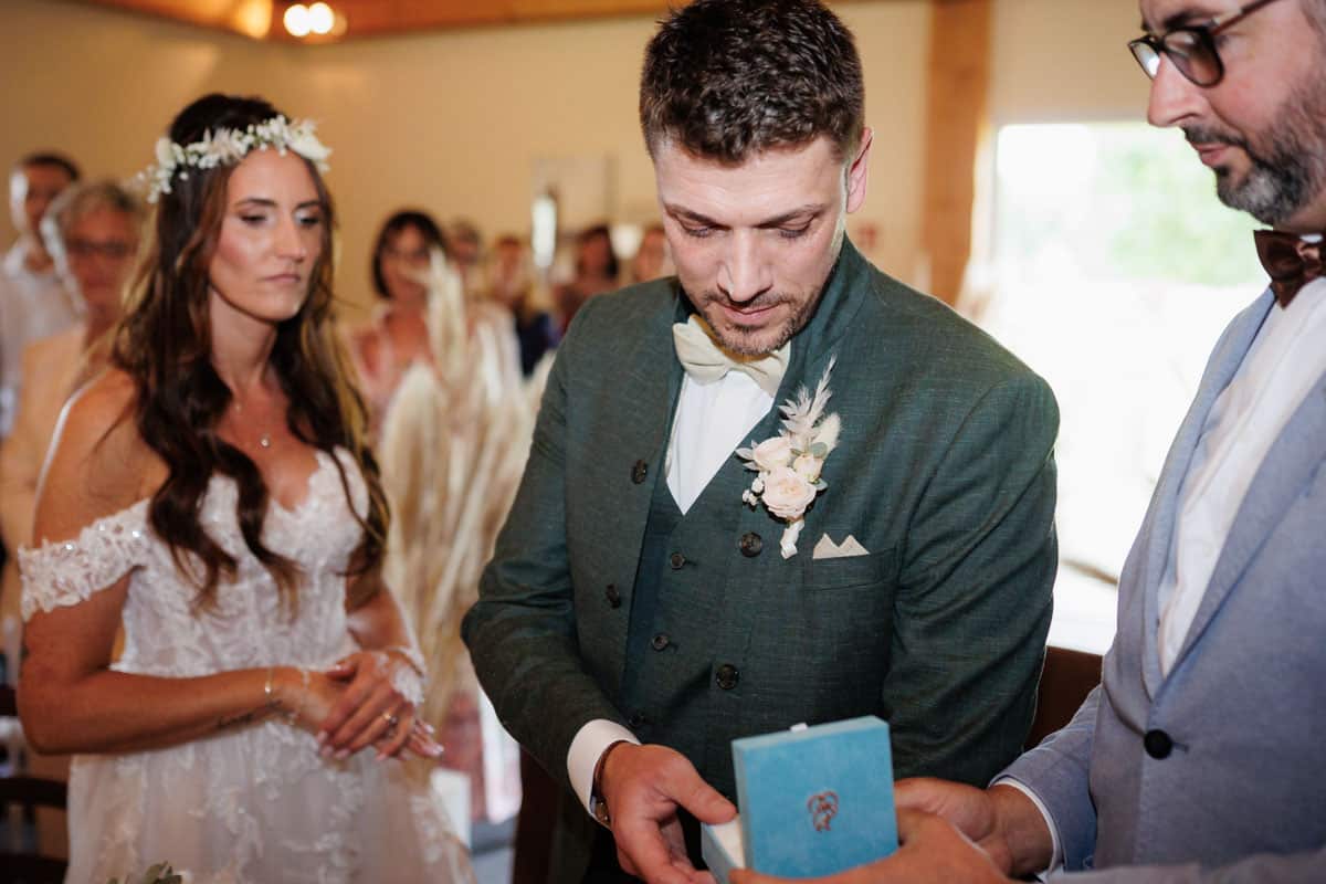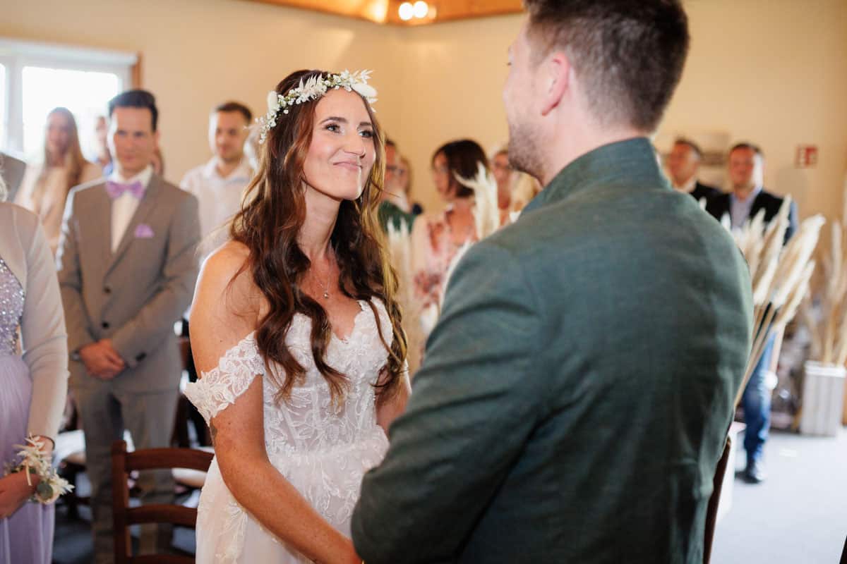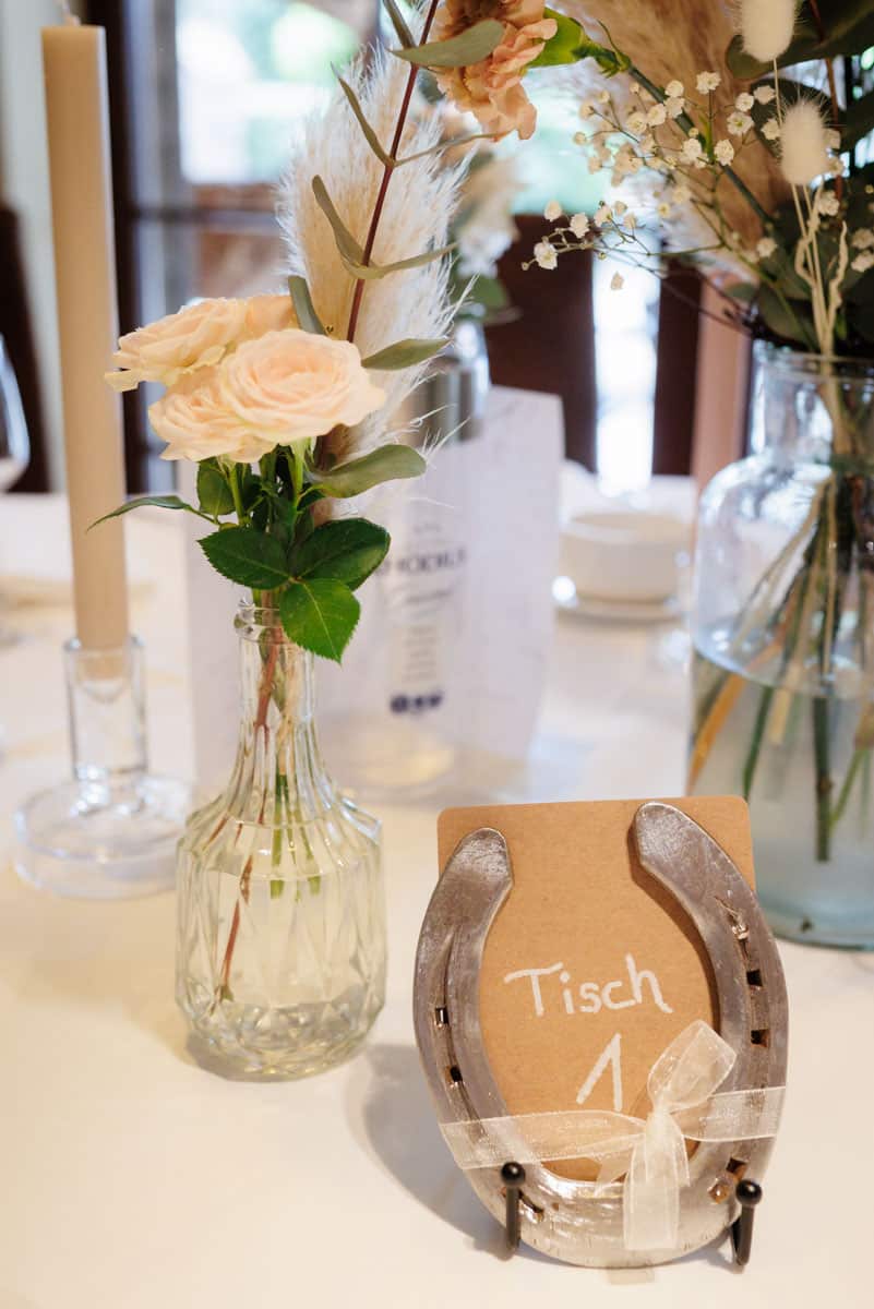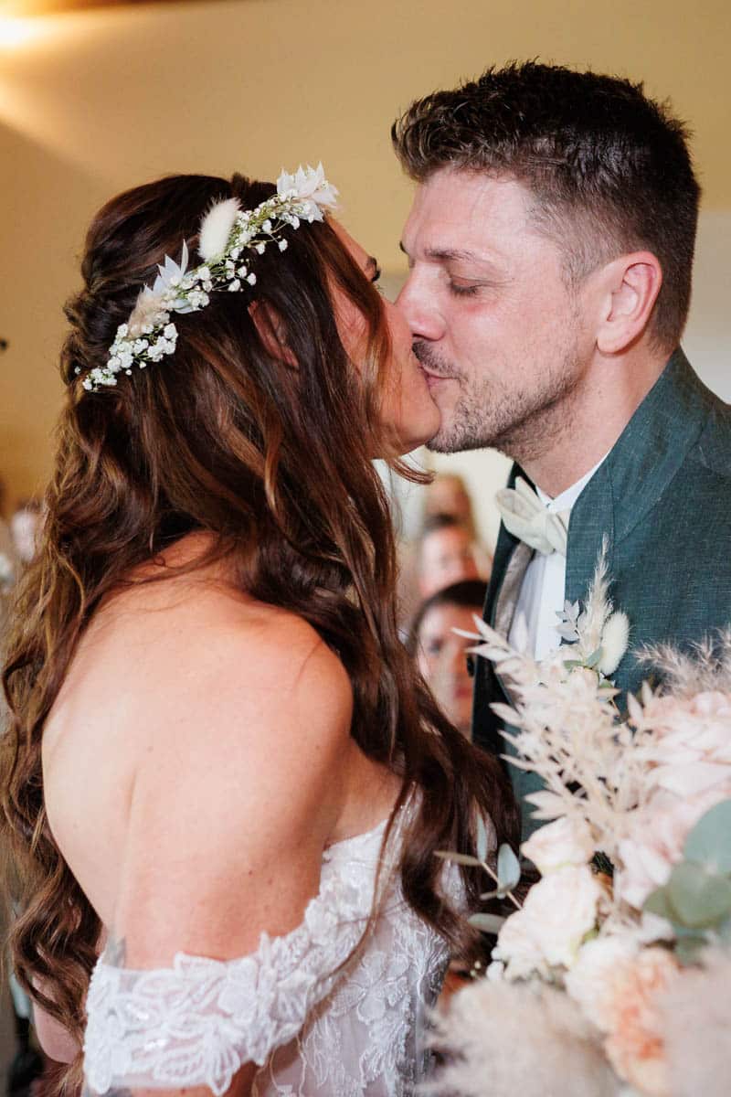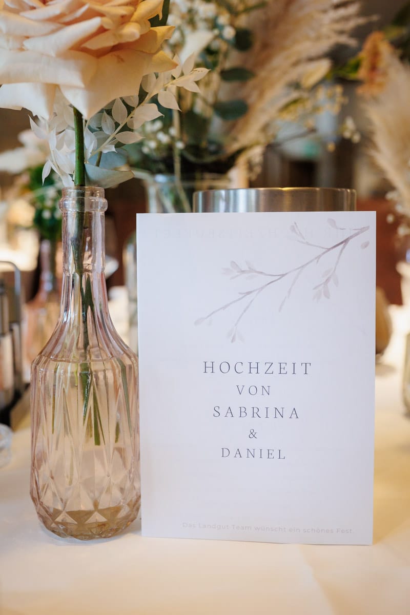 Danach ging es direkt zur freien Trauung, die im Innenbereich des Landguts stattfand. Durch die liebevolle Deko mit Blumen und Kerzen wirkte alles unglaublich stimmungsvoll. Sabrina & Daniel gaben sich das Ja-Wort vor all ihren Gästen – ein Moment, den man einfach nicht vergisst.