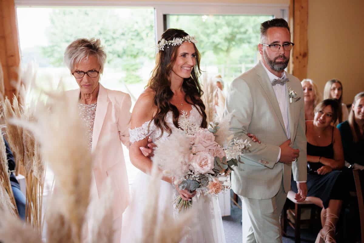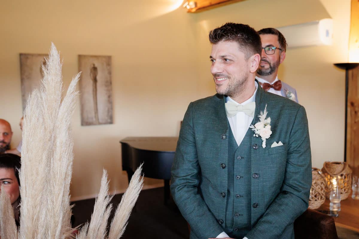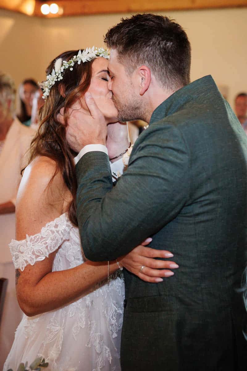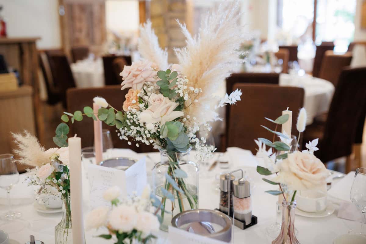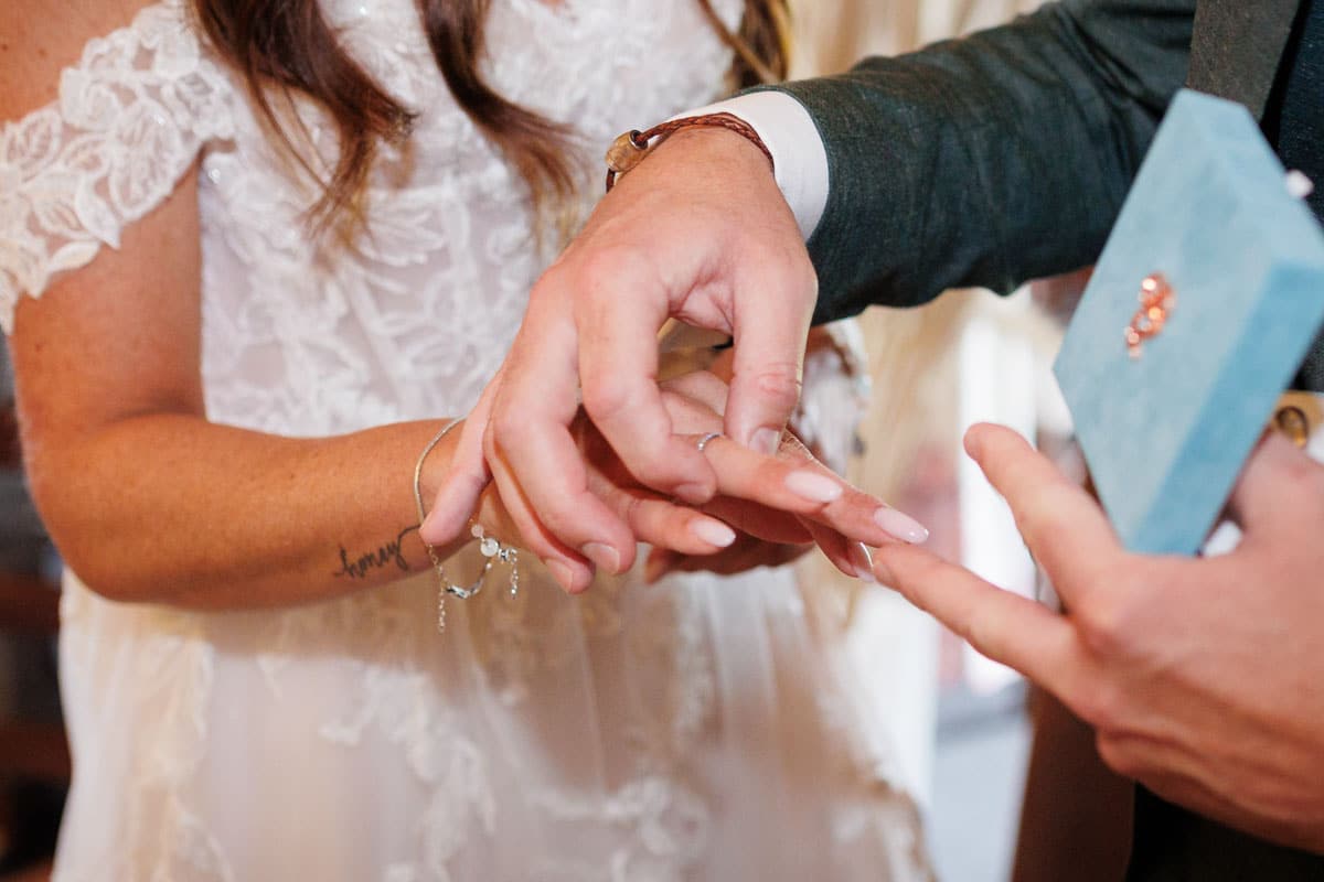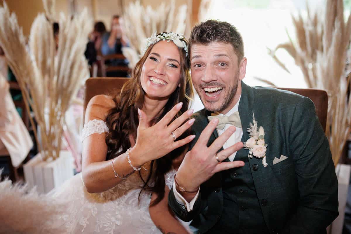 Danach ging es direkt zur freien Trauung, die im Innenbereich des Landguts stattfand. Durch die liebevolle Deko mit Blumen und Kerzen wirkte alles unglaublich stimmungsvoll. Sabrina & Daniel gaben sich das Ja-Wort vor all ihren Gästen – ein Moment, den man einfach nicht vergisst.
