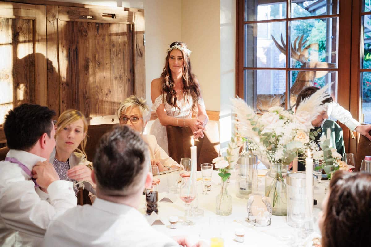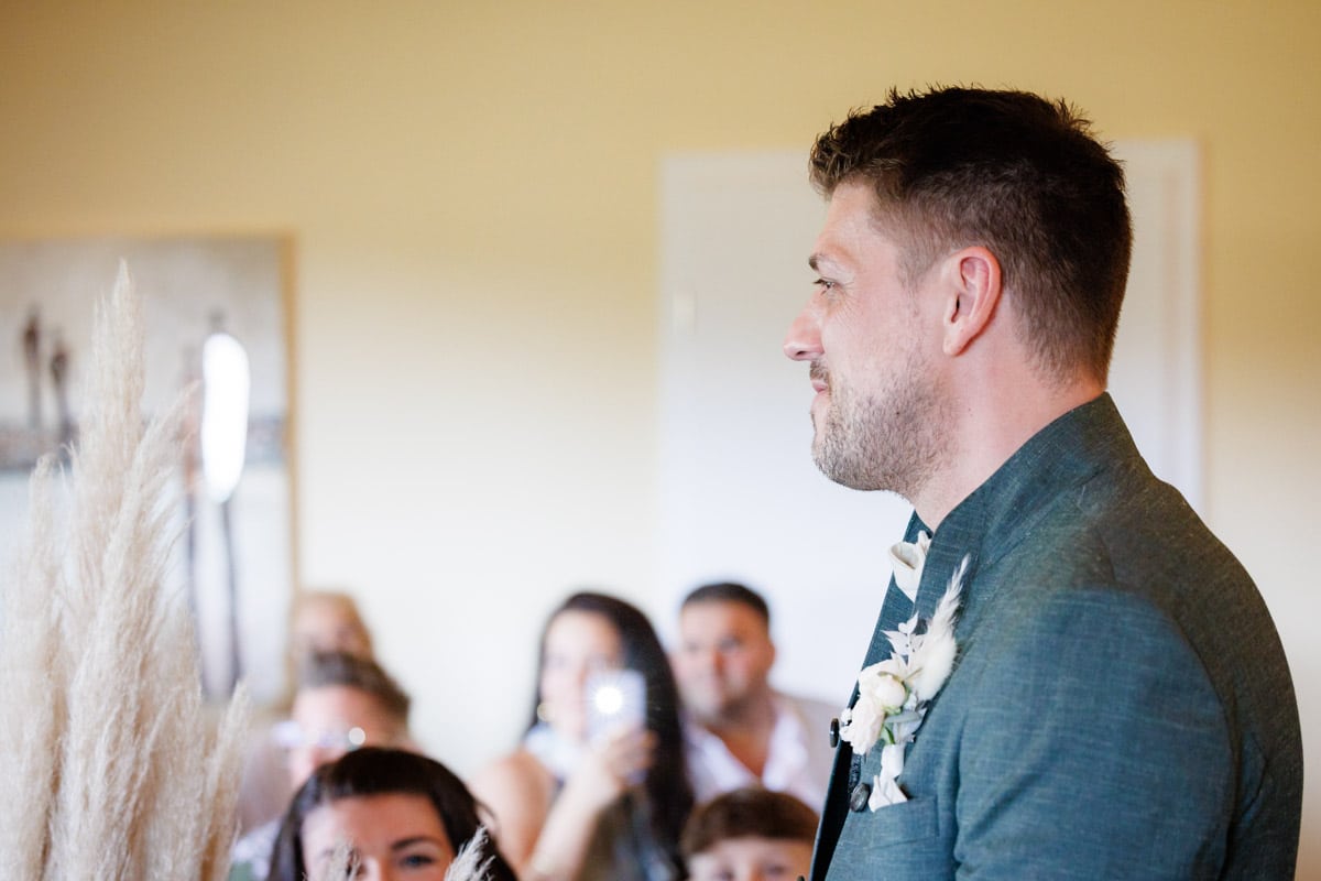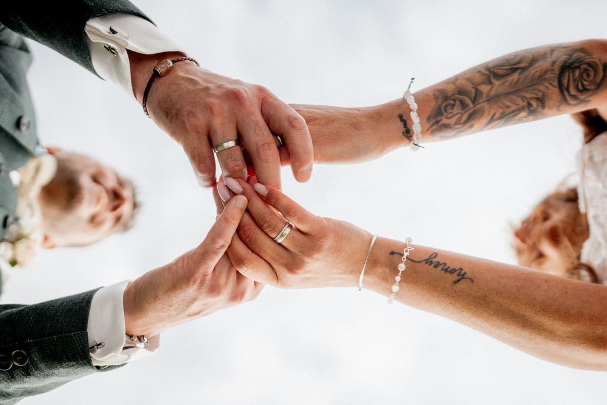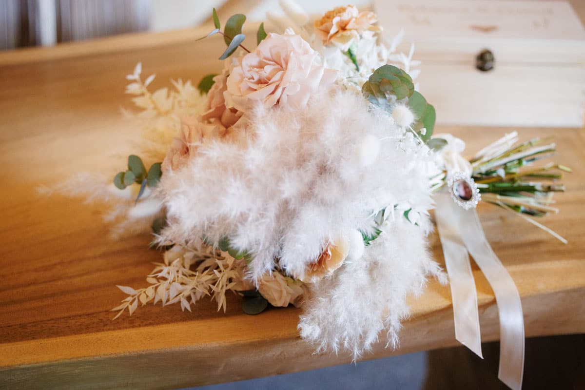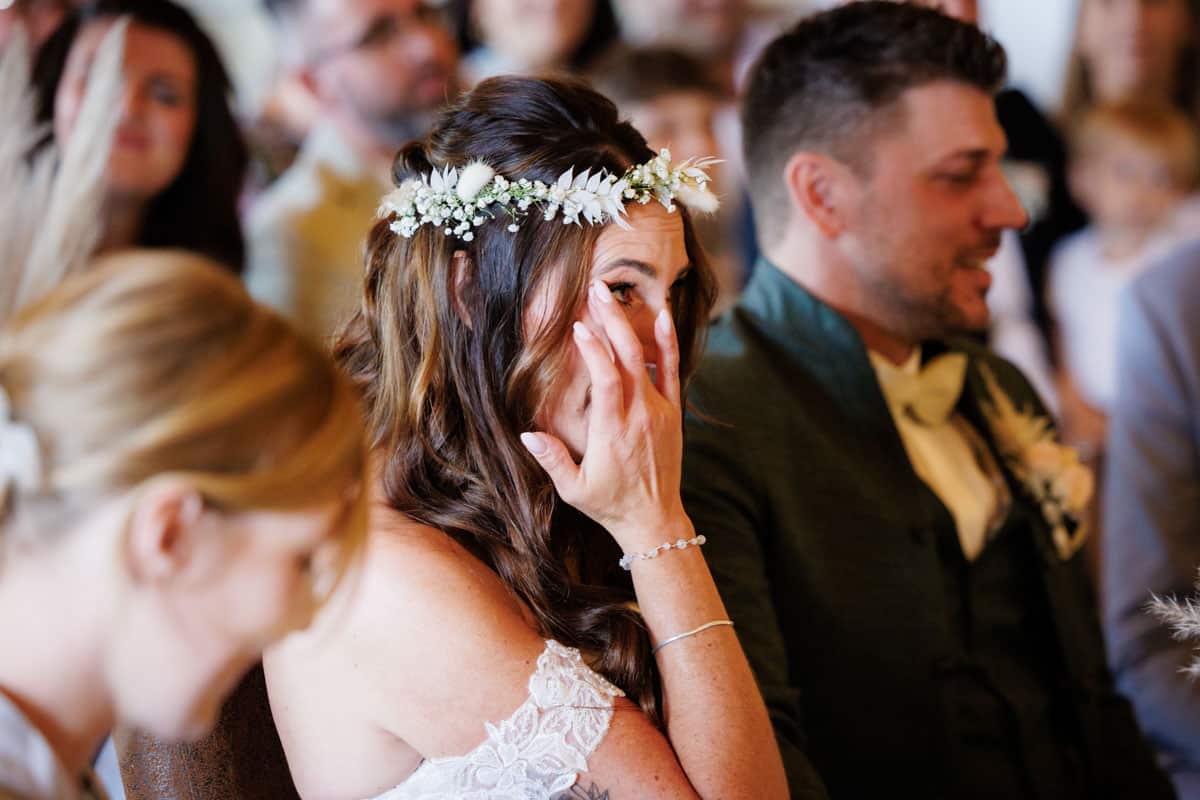 Danach ging es direkt zur freien Trauung, die im Innenbereich des Landguts stattfand. Durch die liebevolle Deko mit Blumen und Kerzen wirkte alles unglaublich stimmungsvoll. Sabrina & Daniel gaben sich das Ja-Wort vor all ihren Gästen – ein Moment, den man einfach nicht vergisst.